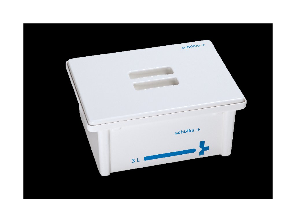 Plastový box na dezinfekci nástrojů, bílé víko s přístrojovou nádobou a výstupním kohoutkem.