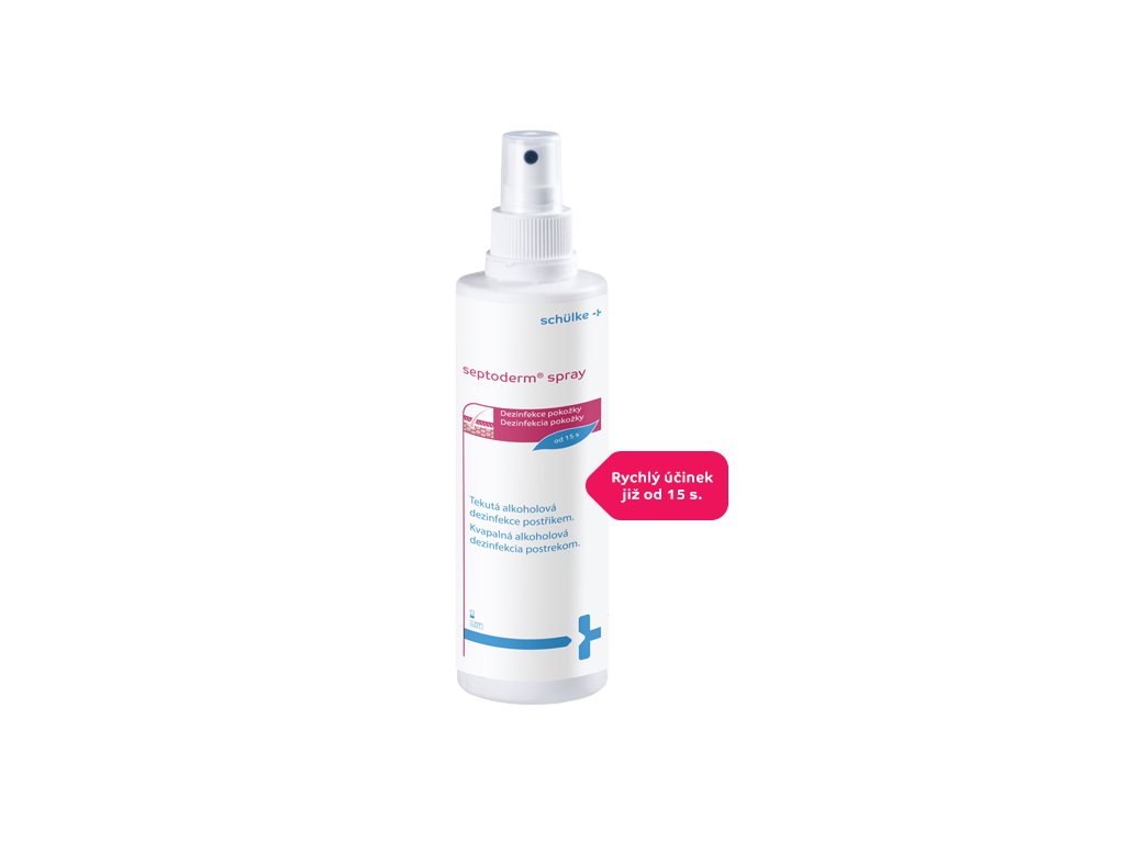 septoderm® spray je vhodný k dezinfekci kůže před zákroky, injekcemi, odběry krve, biopsií zaváděním kanyl, před odstraněním stehů atp.